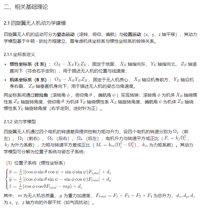 四旋翼无人机凭借其垂直起降、悬停稳定、机动灵活等特性,已广泛应用于航拍测绘、电力巡检、应急救援、物流配送等领域。然而,在实际飞行过程中,四旋翼无人机易受多种干扰因素影响,如气流扰动(阵风、湍流)、负载变化(如挂载设备重量波动)、建模误差(如电机参数摄动、空气阻力系数偏差)以及传感器噪声(陀螺仪、加速度计测量误差),这些因素会导致无人机飞行姿态偏移、位置跟踪精度下降,甚至引发飞行失稳。