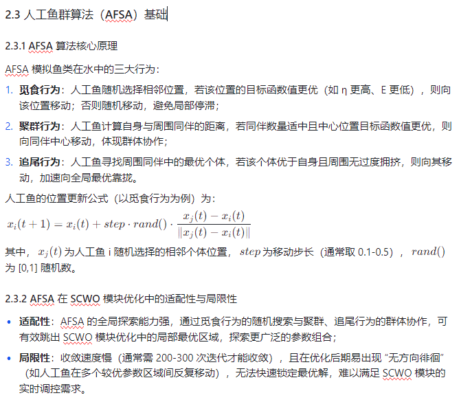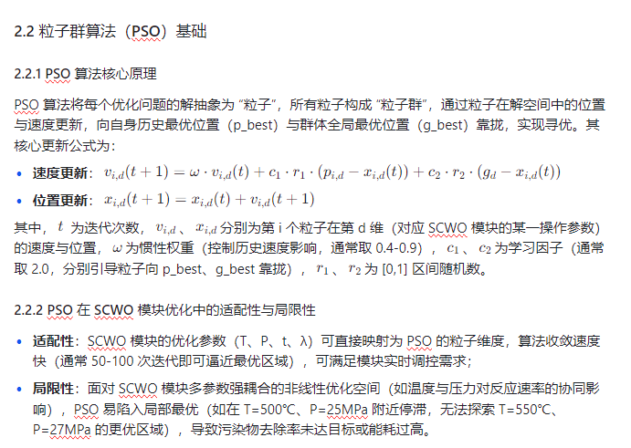粒子群算法(PSO)模拟鸟群觅食的群体协作行为,收敛速度快;人工鱼群算法(AFSA)模拟鱼类觅食、聚群、追尾的生态行为,全局探索能力突出。二者融合可实现 “快速收敛 - 全局寻优” 的协同优势。因此,本文提出基于 PSO-AFSA 混合算法的 SCWO 模块优化方案:通过 PSO 初始化优质种群并快速逼近最优区域,结合 AFSA 的全局搜索能力跳出局部最优,最终实现 SCWO 模块污染物去除率最大化、能耗最小化与设备安全保障的多目标优化,为 SCWO 技术的工业化应用提供技术支撑。