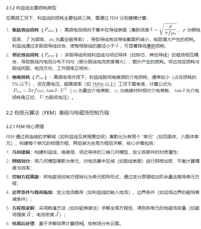 有限元算法(Finite Element Method,FEM)作为一种高效的数值计算方法,可通过离散化复杂几何模型与求解电磁场控制方程,精准捕捉利兹线内部的电流分布与磁场耦合规律,为损耗分析提供可靠的数值支撑。因此,本文提出基于 FEM 的利兹线损耗分析工具设计方案:通过构建利兹线多物理场(电磁场、热场)FEM 模型,开发集 “模型参数化建模 - 电磁场求解 - 损耗计算 - 结果可视化” 于一体的分析工具,实现不同工况下利兹线铜损、铁损(若含磁性介质)的精准计算,为高频电力电子系统的导线选型与优化设计提供技术支撑。
