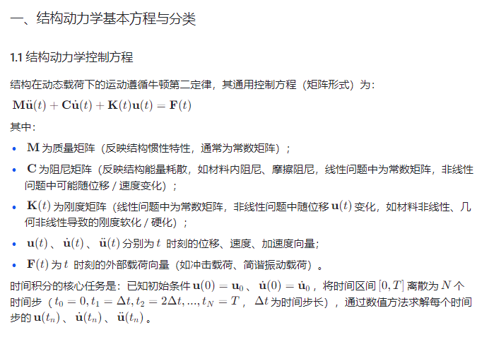 在机械工程领域,结构动力学分析是评估桥梁、高层建筑、机械设备等在动态载荷(如地震、冲击、振动)下响应的核心手段,而时间积分方法则是求解结构动力学方程、获取位移、速度、加速度等动态响应的关键工具。根据结构受力特性(线性 / 非线性)与积分求解逻辑(显式 / 隐式),时间积分方法可分为四大类:线性显式、线性隐式、非线性显式、非线性隐式,不同方法在计算精度、稳定性、效率上存在显著差异,需根据具体工程问题(如冲击载荷下的瞬态响应、长期振动下的疲劳分析)合理选择。