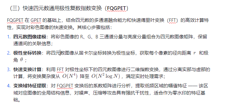 快速四元数通用极性复数指数变换(Fast Quaternion Generalized Polar Complex Exponential Transform, FQGPET)作为一种新型多通道信号处理工具,能够高效融合彩色图像的 R、G、B 三通道信息,同时具备快速计算特性和强抗干扰能力。将其应用于彩色图像零水印技术,可有效解决传统方案的痛点,为彩色图像版权保护提供更优的技术路径。