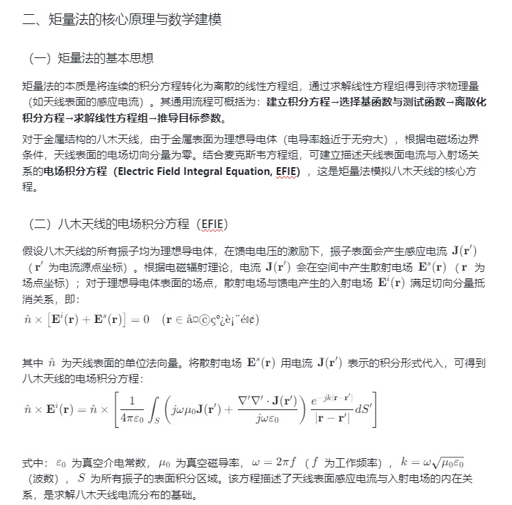 矩量法(Method of Moments, MoM)作为一种基于积分方程的数值计算方法,能够直接求解天线表面的电流分布,进而精确推导其电磁特性,尤其适用于金属结构天线的分析。其核心优势在于:仅需离散化天线的表面或边界(而非整个求解域),大幅降低计算复杂度;同时能自然满足辐射边界条件,避免有限差分法(FDTD)等方法中人工边界带来的误差。将矩量法应用于八木天线模拟,可实现从电流分布到辐射特性的全链路精准计算,为八木天线的优化设计提供可靠的数值支撑。