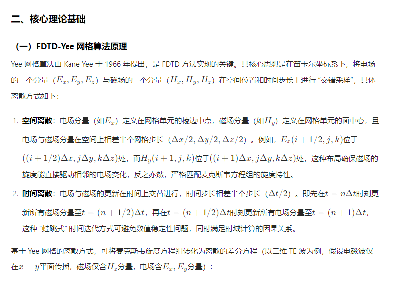 时域有限差分法(Finite-Difference Time-Domain, FDTD)作为一种直接求解麦克斯韦方程组的数值方法,具有时域与空域双重离散、可直观观测电磁波动态传播过程的优势。而 Yee 网格算法作为 FDTD 的核心离散方案,通过将电场分量与磁场分量在空间和时间上交替采样,天然满足麦克斯韦方程组的旋度关系,为精准模拟电磁波的产生、传播与干涉提供了理想的离散框架。