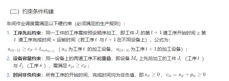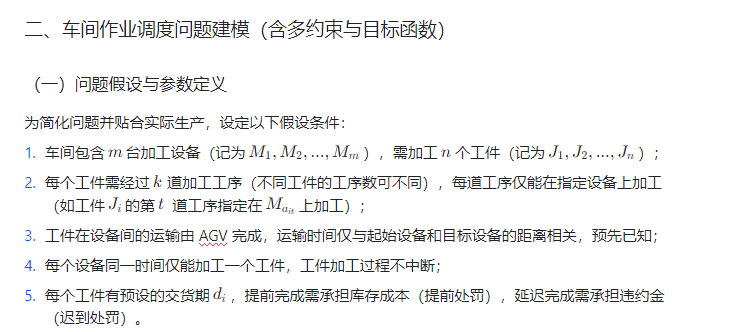车间作业调度是制造业生产管理的核心环节,其目标是在有限资源(设备、人力)约束下,合理安排工件的加工顺序与设备分配,实现生产效率最大化与成本最小化。随着制造业向 “多品种、小批量” 柔性生产转型,传统单一考虑 “加工时间” 的调度模式已无法满足实际需求 —— 工件在设备间的运输时间(如 AGV 搬运耗时)、订单交付的提前 / 迟到处罚(如提前库存成本、迟到违约金)成为影响调度方案经济性的关键因素,亟需构建更贴合实际生产的多目标调度模型。