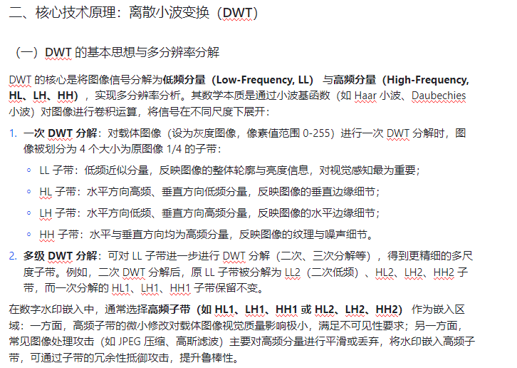 传统的空间域水印技术(如最低有效位替换法,LSB)虽实现简单,但鲁棒性极差,易受压缩、滤波、噪声等攻击影响;而基于变换域的水印技术凭借对图像处理攻击的天然抵抗能力,成为主流研究方向。小波变换(Discrete Wavelet Transform, DWT)作为一种多分辨率分析工具,能够将图像分解为不同频率的子带,其中低频子带对应图像的全局结构(对视觉质量影响大),高频子带对应图像的细节纹理(对视觉质量影响小)。将数字水印嵌入 DWT 变换域的高频子带,既能保证水印的不可见性,又能利用高频子带对攻击的冗余性提升鲁棒性,是当前图像隐藏领域的优选技术路径。