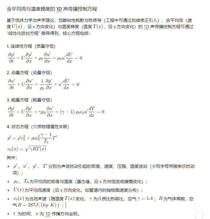 - 平均流的存在会导致声波 “对流效应”—— 顺流方向声波传播速度增加,逆流方向传播速度降低,同时流场的剪切作用会加剧声波衰减;