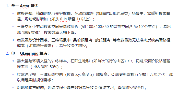 这些特性使低空三维路径规划需同时满足安全性(无碰撞)、高效性(最短路径 / 最低能耗)、可行性(符合无人机动力学约束) 三大目标,传统二维路径规划算法(如平面 Astar)难以适配三维场景,需针对性改进。