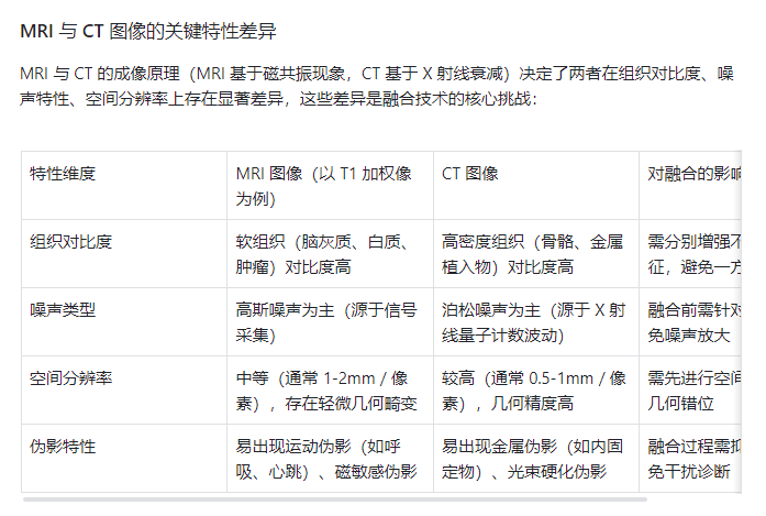理想的 MRI-CT 融合需满足信息完整性(保留双方关键特征)、空间一致性(无几何错位)、视觉清晰度(无伪影) 三大核心需求,传统融合方法(如简单加权、金字塔分解)难以平衡多模态图像的特性差异,需借助更精准的图像增强与特征提取模型。
