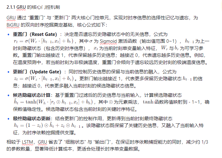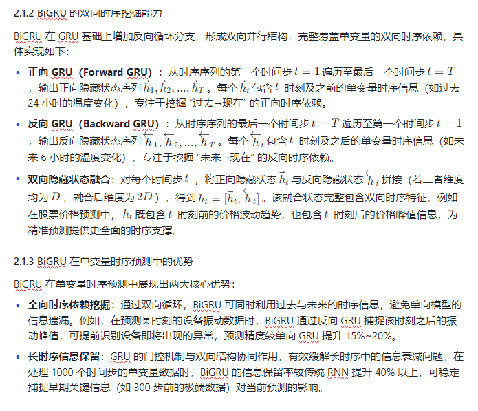 BiGRU 基于 GRU 的门控机制,通过 “正向 GRU + 反向 GRU” 的并行结构,实现对单变量时序数据双向依赖的全向挖掘,同时保留 GRU 简洁高效的特性,有效解决双向时序依赖与长时序信息衰减难题。