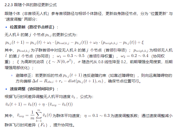 每个麋鹿子群由经验丰富的首领带领,其他个体跟随首领调整移动方向;算法中,每个子群选择 Pareto 前沿层中的优质个体(路径方案)作为 “首领无人机”,子群内其他无人机(跟随个体)参考首领路径与相邻无人机路径,通过 “位置修正” 优化自身路径节点,平衡个体性能与群体协同(如调整速度以同步到达时间,修正节点位置以避开障碍物)。