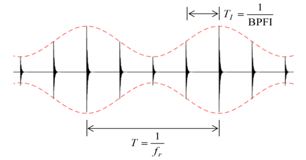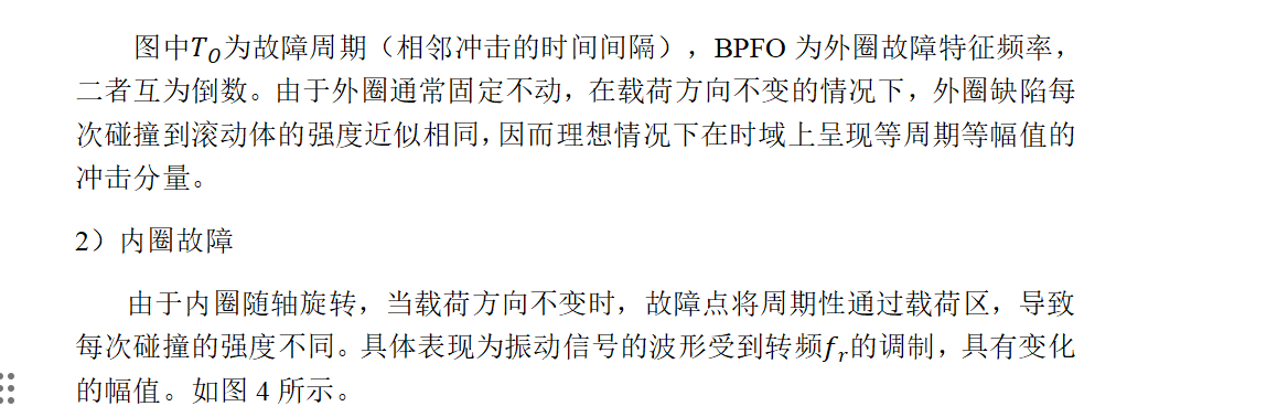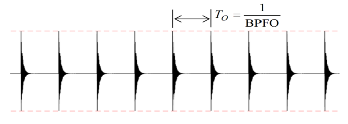 图中为故障周期(相邻冲击的时间间隔),BPFO为外圈故障特征频率,二者互为倒数。由于外圈通常固定不动,在载荷方向不变的情况下,外圈缺陷每次碰撞到滚动体的强度近似相同,因而理想情况下在时域上呈现等周期等幅值的冲击分量。