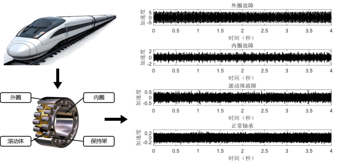 列车轴承的工作环境往往较为恶劣,在长时间运行过程中,轴承部件可能因过热、润滑不良、腐蚀等多种因素发生损坏,进而影响列车正常运行。轴承故障诊断是指通过监测轴承运行状态下的各类信号(其中振动加速度信号为主要监测数据),运用数据挖掘、信号处理及机器学习等技术手段,判定轴承是否存在故障的技术。从本质上讲,基于机器学习的故障诊断问题属于模式识别问题——通过信号处理等技术提取故障特征,再借助机器学习模型实现精准分类,是该领域常见的实现路径。其核心目标在于实现对故障的提前预警与精准诊断,从而避免设备突发性失效,为列车的安全运行提供可靠保障。