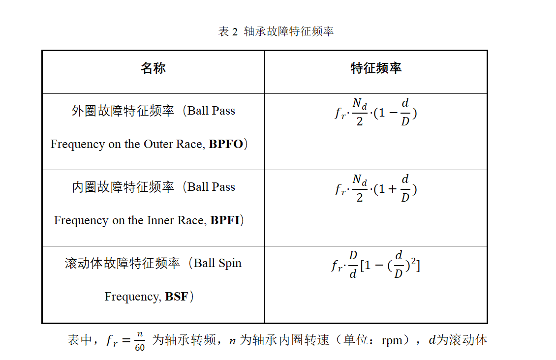 这类轴承故障的频率特性通常由故障特征频率来描述,该频率可通过轴承转速、滚动体数量、滚动体直径等固有参数计算得出,具体计算公式如表2所列。