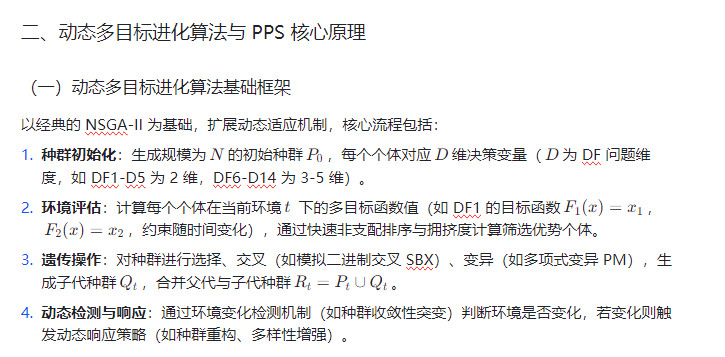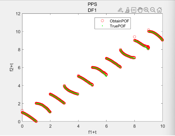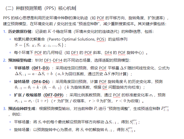 传统动态多目标进化算法(如 DMOEA/D、NSGA-II-D)面临两大核心挑战:1)环境变化后,种群需重新搜索最优解,易出现 “跟踪滞后”;2)动态场景中种群多样性易流失,导致算法陷入局部最优。而种群预测策略(Population Prediction Strategy, PPS)通过分析历史种群演化规律,预测环境变化后的潜在最优种群分布,可有效缩短重新搜索时间,提升 POF 跟踪效率,成为解决 DF1-DF14 的关键技术。