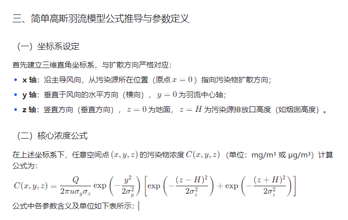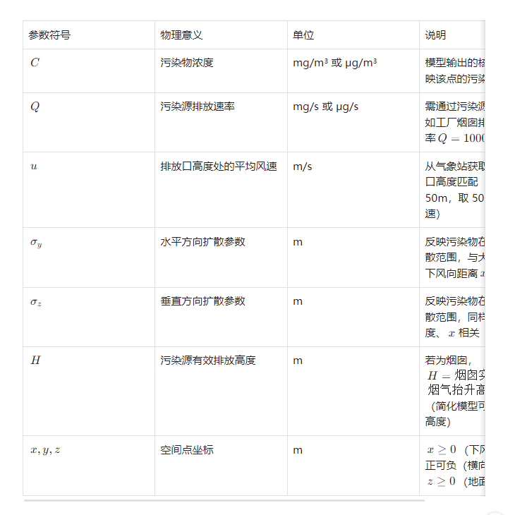 - 正态分布假设:污染物在垂直于 plume(羽流)中心轴的水平方向(y 轴,垂直于风向)和垂直方向(z 轴,竖直方向)的浓度分布均服从高斯(正态)分布;
