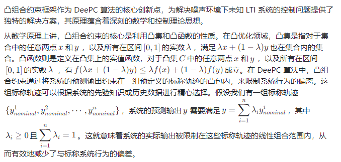 凸组合约束框架为 DeePC 算法在噪声环境下的未知 LTI 系统控制中提供了坚实的理论和实践基础,通过巧妙地限制系统行为和降低对模型精度的依赖,显著提高了轨迹跟踪性能。