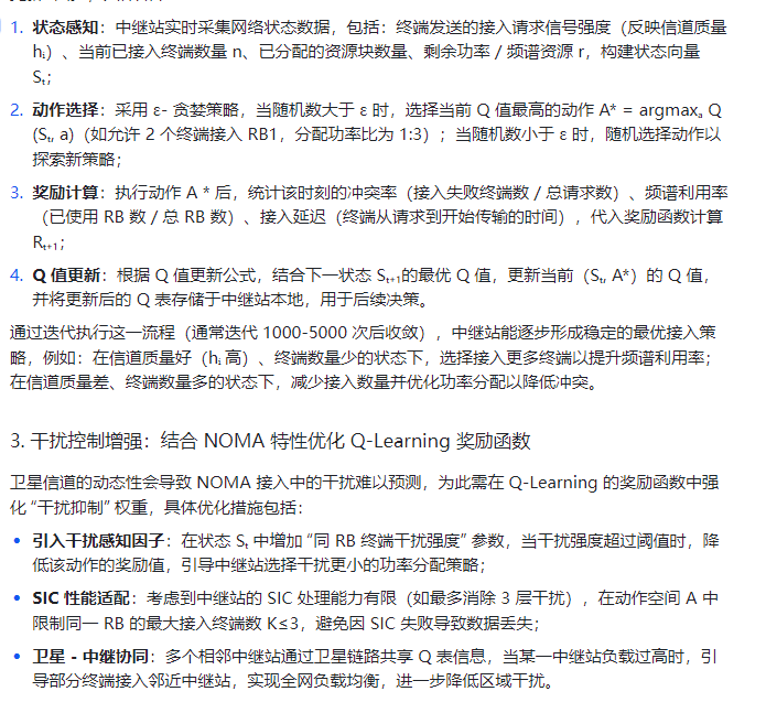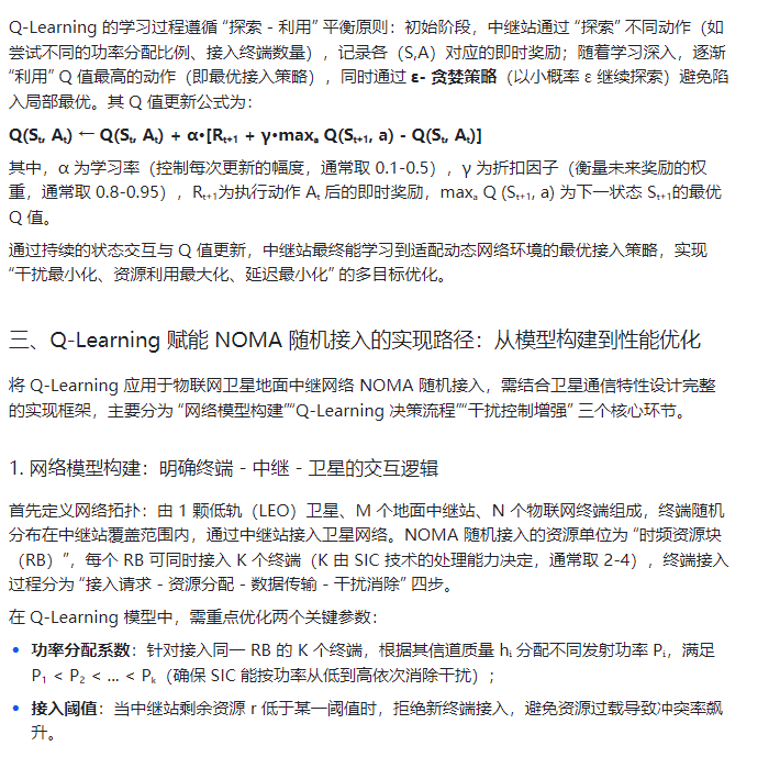 随着物联网(IoT)技术的高速发展,海量终端设备的接入需求与日俱增,尤其在偏远地区、海洋、航空等传统地面网络覆盖不足的场景中,卫星地面中继网络成为关键支撑。然而,传统正交多址(OMA)技术因频谱资源分配固定、接入效率低,难以应对物联网终端 “海量、低功耗、广分布” 的接入特性,非正交多址(NOMA)技术虽通过信号叠加实现频谱复用,但随机接入过程中的干扰控制、资源分配优化仍是亟待解决的核心难题。在此背景下,Q-Learning 强化学习算法凭借其无模型、自适应决策的优势,为卫星地面中继网络的 NOMA 随机接入优化提供了创新解决方案。