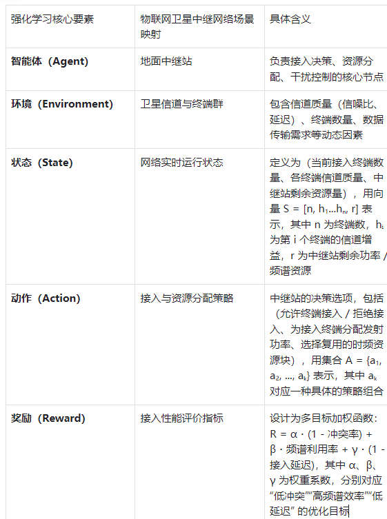 Q-Learning 是一种基于价值函数的无模型强化学习算法,其核心思想是通过智能体(Agent)与环境(Environment)的交互,学习 “状态(State)- 动作(Action)” 对应的最优价值(Q 值),最终实现长期收益最大化。在物联网卫星地面中继网络 NOMA 随机接入场景中,这一逻辑被巧妙转化为 “中继站 - 终端” 的接入决策优化过程,具体映射关系如下: