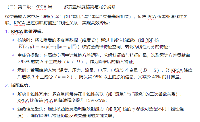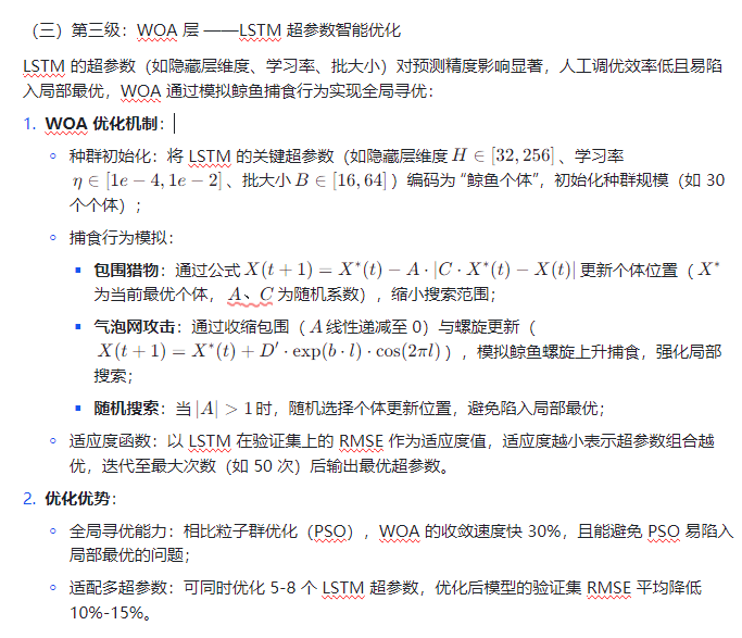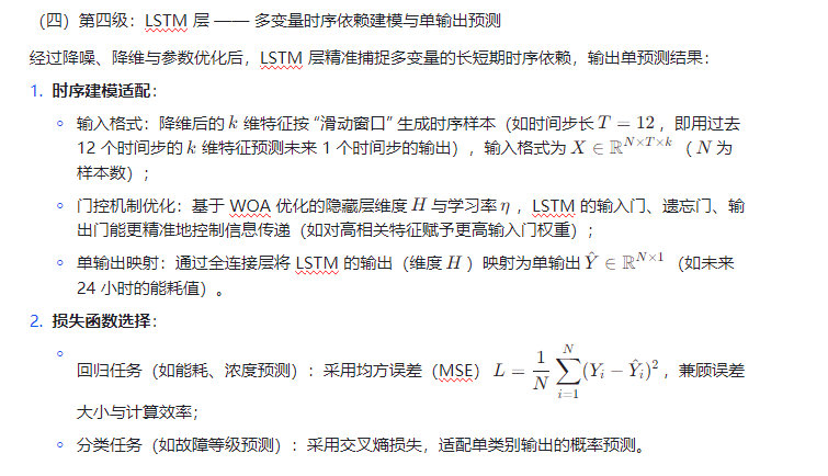 EMD-KPCA-WOA-LSTM 的结构设计围绕 “噪声过滤→维度精简→参数优化→时序建模” 展开,每个模块均针对多输入单输出场景的痛点设计,形成完整技术链: