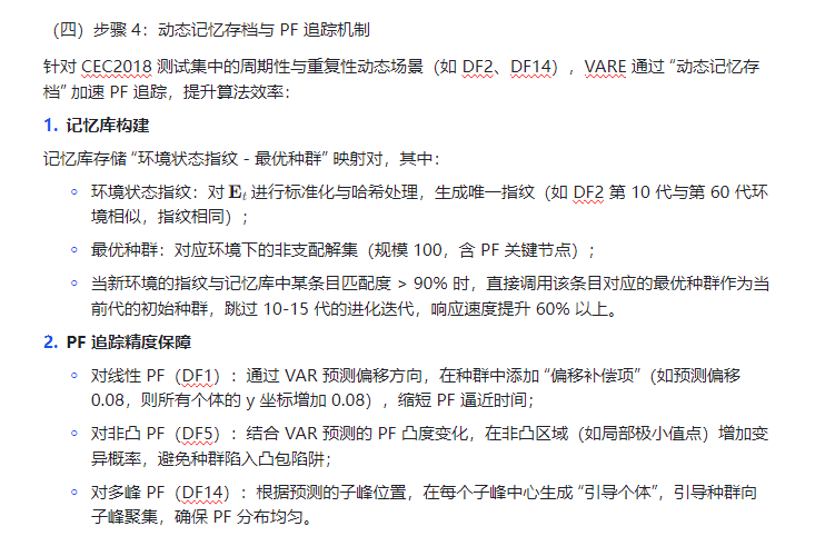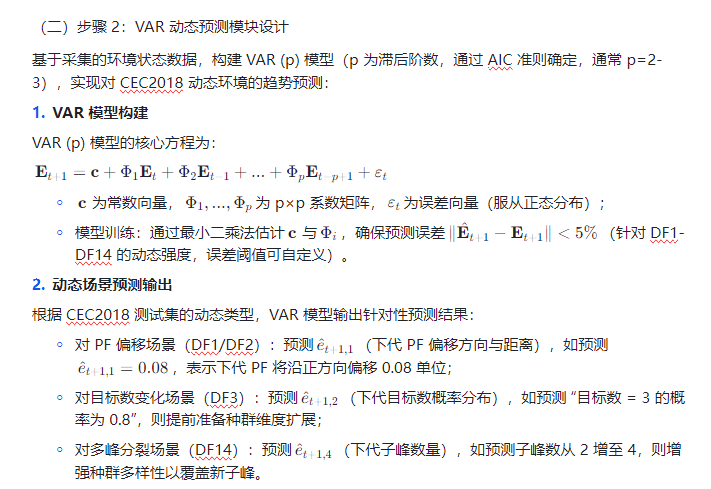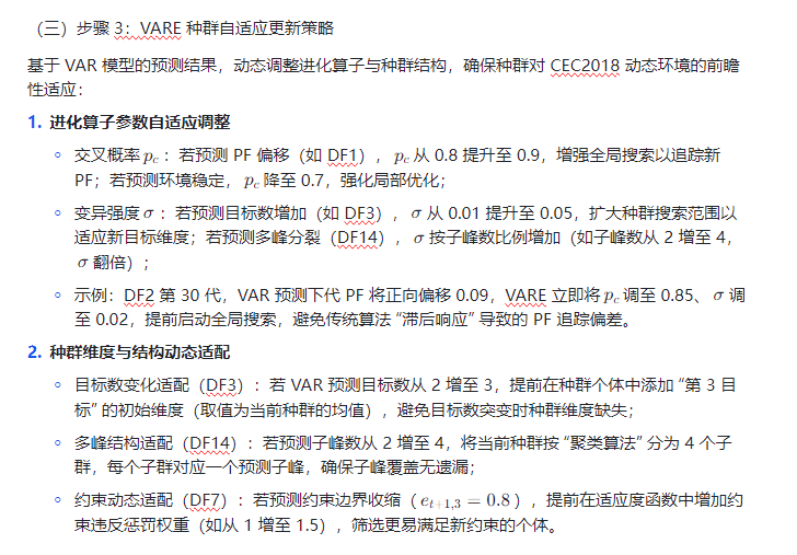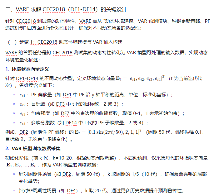 VARE 的核心创新在于将 “向量自回归模型” 嵌入传统多目标进化算法,通过 VAR 模型预测动态环境变化趋势,指导种群自适应更新,突破传统算法 “被动响应动态” 的局限,其核心机制与 CEC2018 测试集的适配性如下: