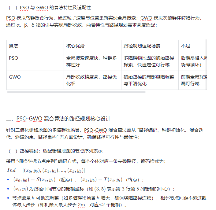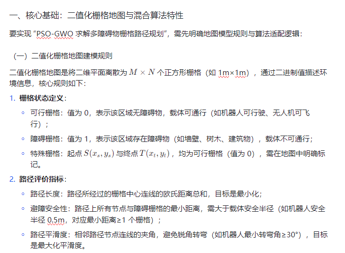 在移动机器人导航、无人机自主飞行等领域,二值化栅格地图(将二维平面划分为均匀栅格,用 “1” 标记障碍物、“0” 标记可行区域)是路径规划的常用环境模型。传统粒子群算法(PSO)虽具备全局搜索速度快的优势,但易陷入局部最优(如围绕障碍物反复搜索);灰狼算法(GWO)虽局部收敛精度高,却存在前期全局探索能力弱的问题。基于 PSO-GWO 混合算法的路径规划方案,通过 “PSO 全局寻优 + GWO 局部精调” 的协同逻辑,既能快速覆盖多障碍物栅格地图的可行域,又能精准优化路径节点以避开障碍物,最终生成 “无碰撞、短路径、高平滑度” 的最优路径,适配机器人、无人机等载体的实际运动需求