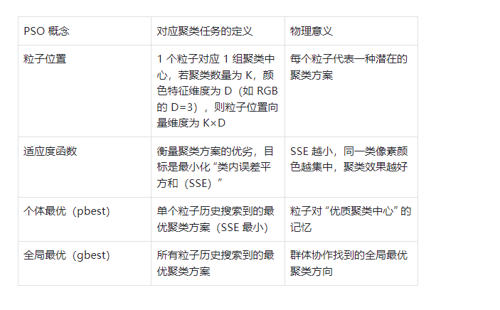 将图像颜色聚类问题转化为 “寻找最优聚类中心” 的优化问题,PSO 的关键概念与聚类任务的对应关系: