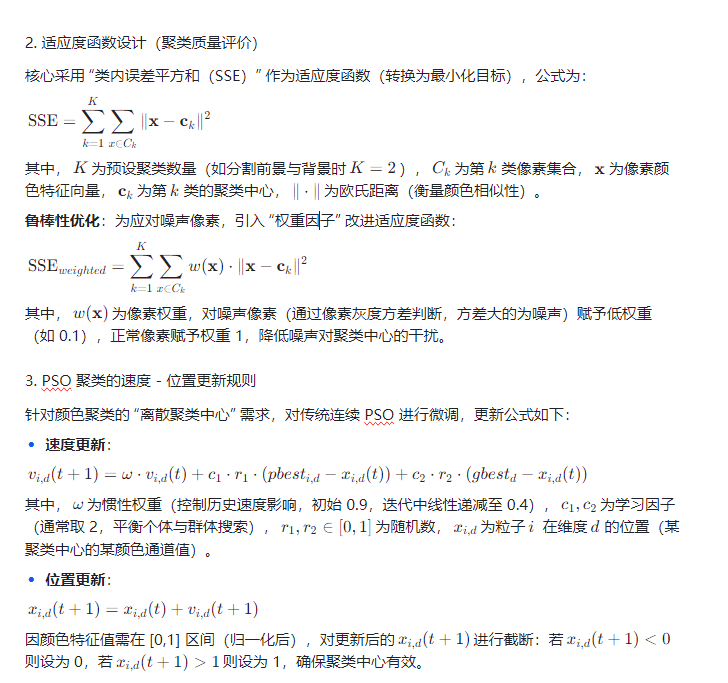 - 均值漂移算法:无需预设聚类数量,但计算复杂度高(O (n²),n 为像素数),高分辨率图像处理时间是 PSO 的 3-5 倍;