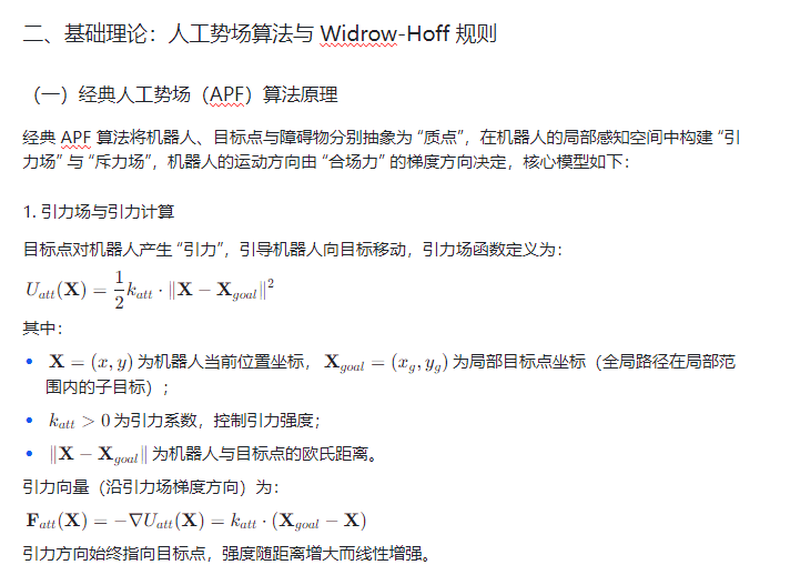 Widrow-Hoff 规则(最小均方误差 LMS 学习规则)是一种经典的自适应线性学习算法,具有 “实时参数调整”“收敛速度快”“计算复杂度低” 的优势,可通过机器人实时感知数据动态优化 APF 的关键参数,解决势场局部极小值与参数适配问题。两者融合形成的局部路径规划器,既能保留 APF 的梯度引导特性(确保路径平滑),又能通过 Widrow-Hoff 规则实现参数自适应(提升动态避障鲁棒性),适用于仓储、商场、园区等动态复杂场景。