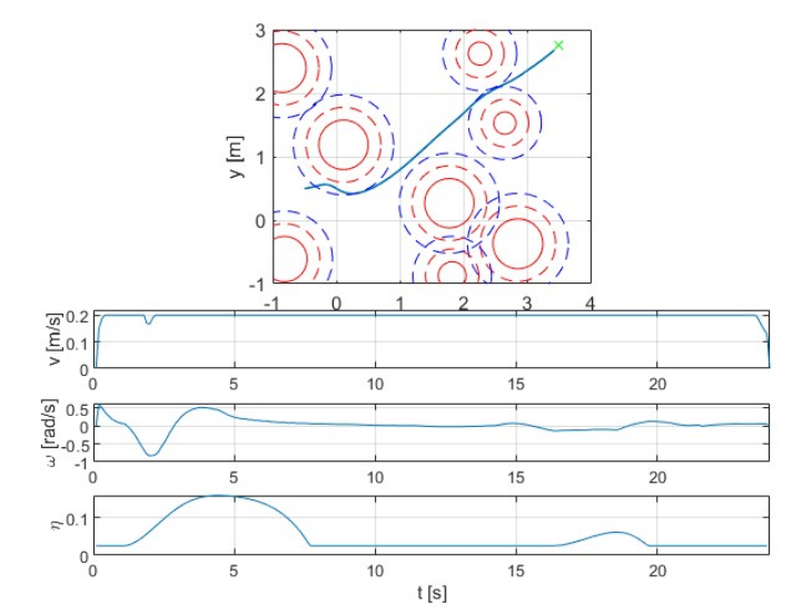 for t = 1:1000 % 计算吸引力 F_att = -k_att * (q - goal); % 计算斥力 F_rep = [0, 0]; fori = 1:num_obs d = norm(q - obstacles(i, :)); if d < d0 F_rep = F_rep + k_rep * (1/d - 1/d0) * (1/d^2) * (q - obstacles(i, :)) / d; end end % 计算总力 F_total = F_att + F_rep; % 更新Widrow-Hoff权重 w = w + eta * (norm(F_att) - norm(F_rep)) * norm(F_total); % 机器人运动 q = q + w * F_total * 0.05; path = [path; q]; % 终止条件 if norm(q - goal) < 0.1 break; endend% 画图figure;subplot(2,1,1);hold on;scatter(obstacles(:,1), obstacles(:,2), 100, 'r', 'filled');plot(path(:,1), path(:,2), 'b', 'LineWidth', 2);scatter(goal(1), goal(2), 100, 'g', 'filled');xlabel('x [m]');ylabel('y [m]');