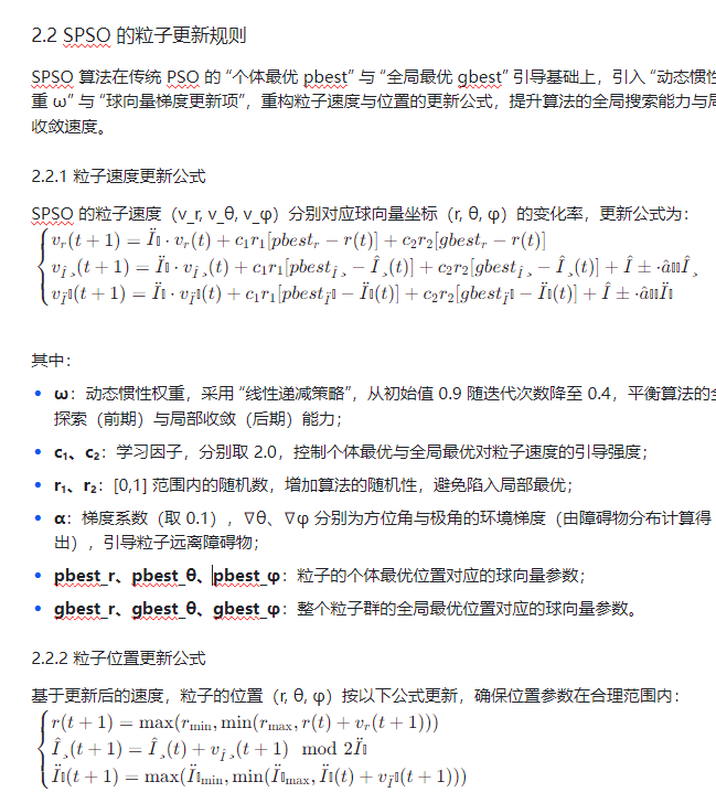 针对传统算法的局限,基于球向量的粒子群优化(SPSO)算法通过 “球向量坐标表示粒子位置”“动态权重更新规则”“平滑性约束函数” 三大创新,重构粒子群优化框架,实现无人机路径规划的精准性、实时性与低能耗统一。