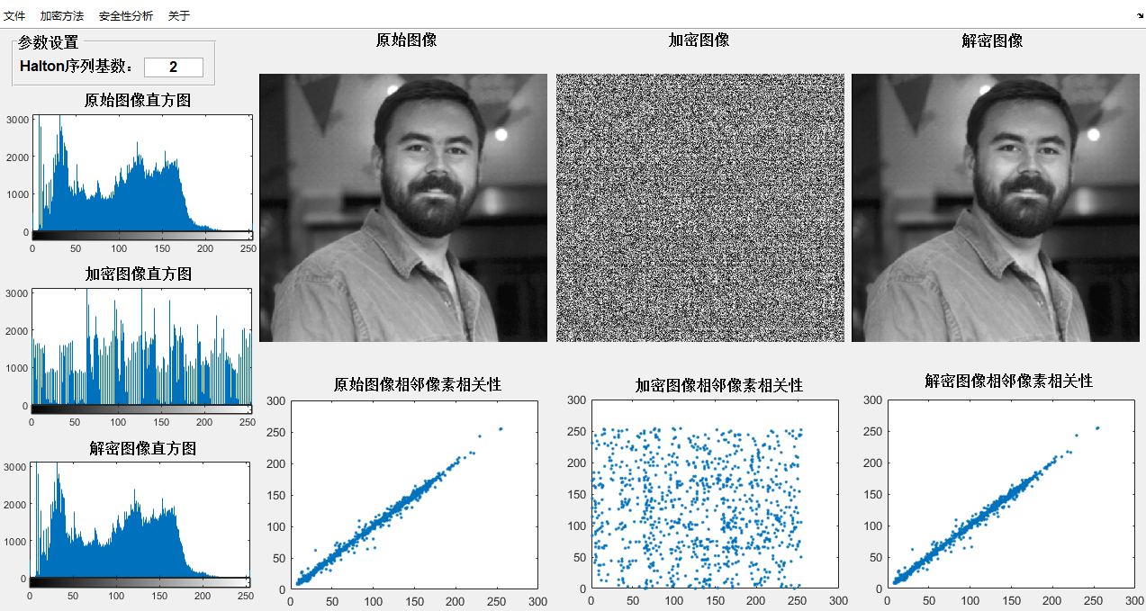 - 安全性需求:需打破原始图像的像素相关性(相邻像素灰度值相似)与直方图分布(特定灰度值集中)。Halton 序列的低差异度确保位置扰乱时像素均匀分散,像素扰乱时密钥空间足够大(基选择、起始索引、序列长度均可作为密钥参数),抵抗暴力破解;