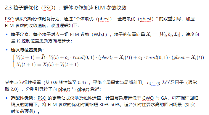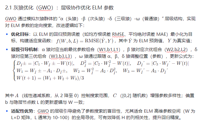 为此,需引入灰狼优化(GWO)、遗传算法(GA)、粒子群优化(PSO)三种智能优化算法,对 ELM 的输入 - 隐层参数(W、b)及隐层节点数 L 进行协同优化,构建高精度、高稳定的 ELM 回归预测模型。