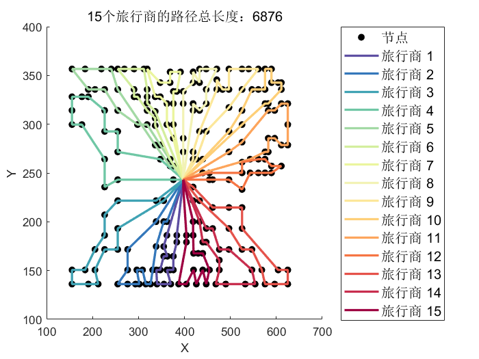 :以最小化所有旅行商的总行程距离或整体运营成本等为目标,定义适应度函数,用于评估每个个体的优劣。