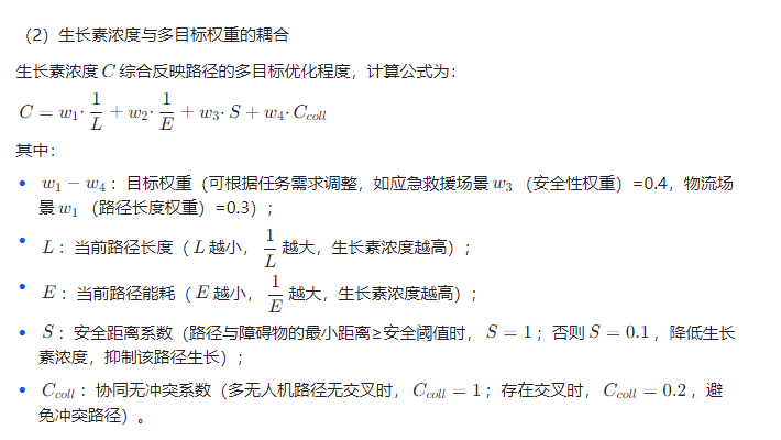 MOPGA 通过 “生长点”(对应无人机的路径节点)、“生长素浓度”(对应路径优化目标的权重)、“光照强度”(对应终点的吸引力)三个核心要素,构建多目标优化模型,其关键机制与路径规划的映射关系如下: