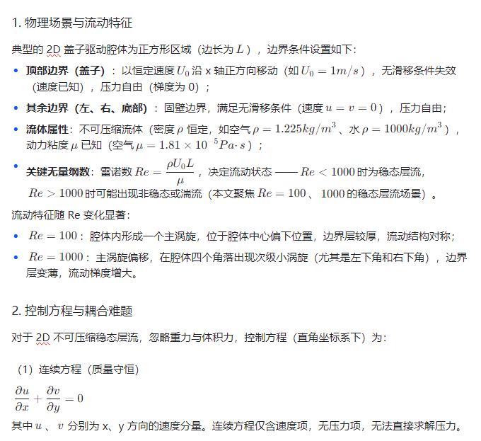 要理解 SIMPLE 算法的应用价值,首先需明确盖子驱动腔体流动的物理本质与数值仿真的核心难点。这类流动属于不可压缩粘性流动,其运动规律由纳维 - 斯托克斯(N-S)方程组控制,而速度与压力的强耦合特性是数值求解的关键瓶颈。