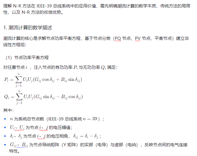 - 鲁棒性强:通过雅可比矩阵反映节点间的强耦合关系,即使在 IEEE-39 系统的重负荷、环网运行场景下,仍能保持稳定收敛;
