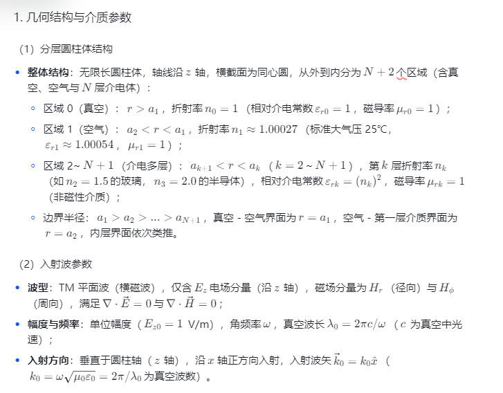 首先明确几何结构、入射波参数与坐标系,为后续场方程建立奠定基础 —— 介电多层圆柱体的无限长特性(z轴方向无变化)可将三维问题简化为二维横平面(