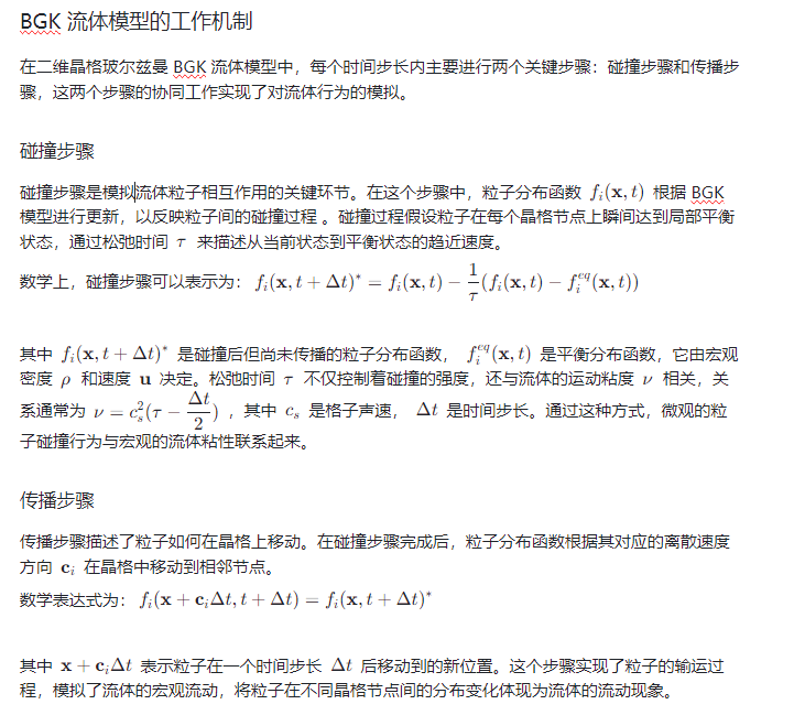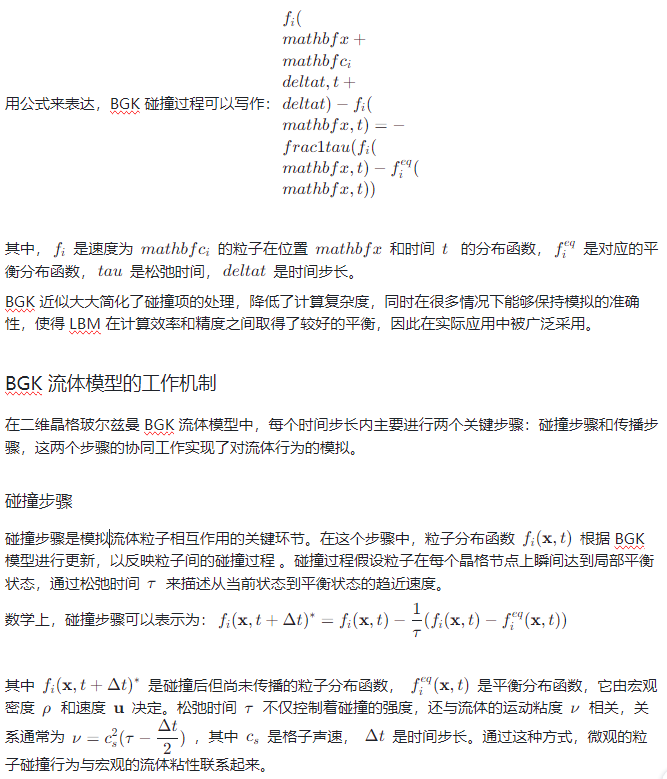 BGK 近似是 LBM 中用于简化碰撞项处理的一种常见方法。它假设粒子之间的碰撞是一个局部的、各向同性的过程,并且可以用单一的松弛时间(tau)来描述。在实际计算中,通过将粒子分布函数与平衡分布函数(feq_i)的差异经过松弛时间调整,从而实现宏观流体参数(如密度和速度)的计算。