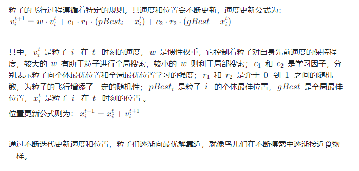 在 PSO 的世界里,每个优化问题的候选解都被看作是一只 “粒子”,这些粒子在多维搜索空间中飞行,它们拥有自己的位置和速度。位置代表着候选解在解空间中的坐标,速度则决定了粒子移动的方向和速率。每个粒子还具备两个关键属性:个体最佳位置(pBest),即单个粒子在飞行过程中迄今为止找到的最优解;全局最佳位置(gBest),是所有粒子在整个搜索过程中找到的最优解。