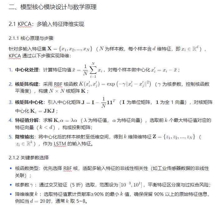 - KPCA(核主成分分析):解决多输入特征冗余问题,通过核函数(如 RBF 核)将高维非线性特征映射至低维线性空间,保留关键区分性信息,降低后续模型计算复杂度;