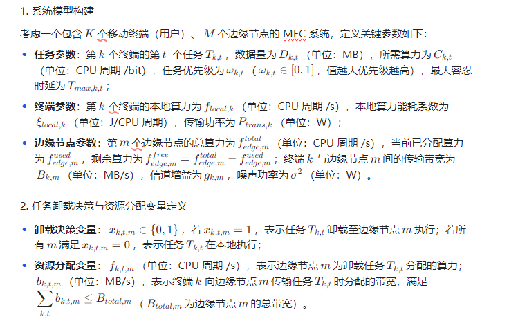 - 资源负载均衡:边缘节点的计算资源(CPU 核心数、算力)与带宽资源有限,若多个任务集中卸载至同一节点,易导致资源拥塞,需避免单点负载过高;