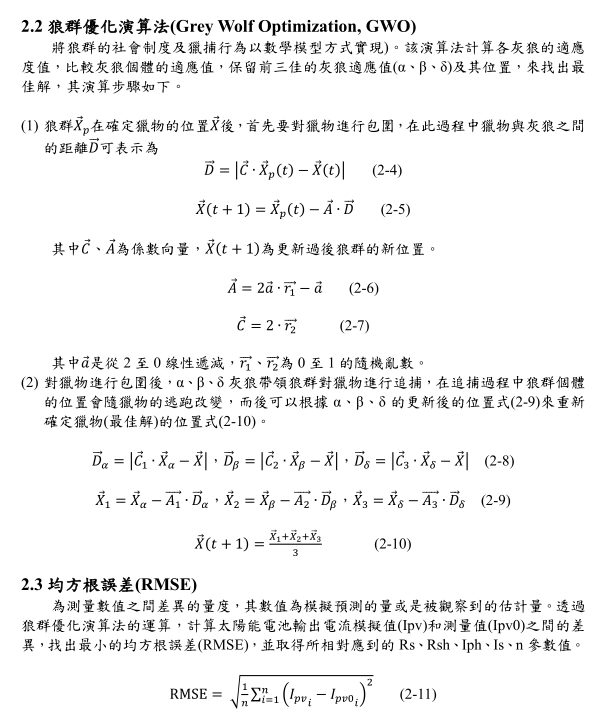 本專題以狼群優化演算法(Grey Wolf Optimizer, GWO)為架構並使用數學軟體 Matlab 進行模擬,透過不斷的優化將太陽能電池所需的的五個重要參數逼近實際測量的數值,並使太陽能電池輸出電流的實際值與程式模擬出來的計算值之間的均方根誤差(RMSE)達到最小,最終讓兩者的 I-U 特性曲線十分接近,完成本專題將太陽能電池實際運作結果以 Matlab模擬呈現並取得參數之目標。