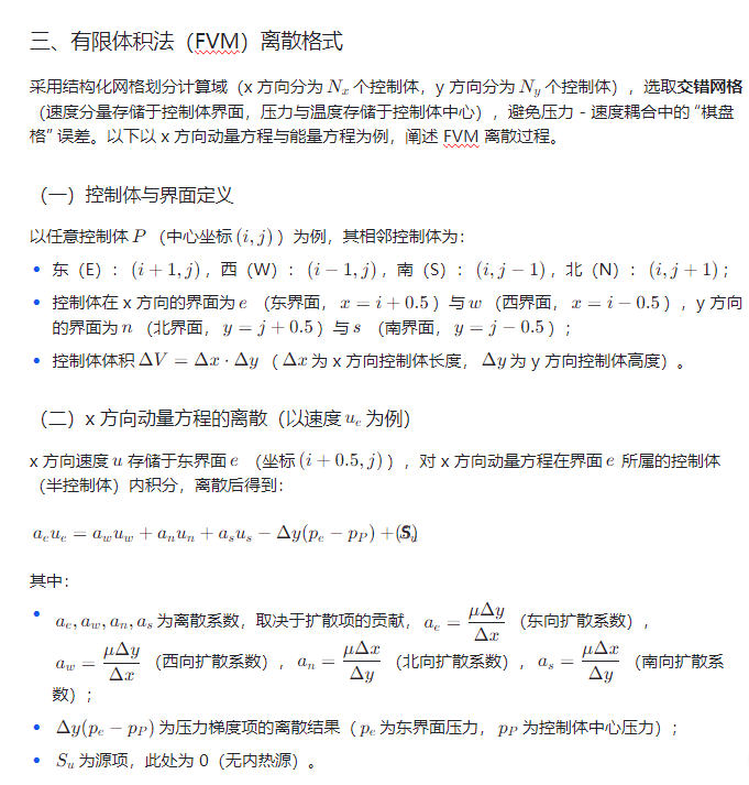 传统解析方法(如纳维 - 斯托克斯方程的相似解)仅适用于简单边界条件(如恒壁温、恒热流),无法应对复杂加热模式(如局部加热、非均匀热流);而有限体积法(FVM)凭借 “守恒性好、边界处理灵活” 的优势,结合 SIMPLE 算法解决压力 - 速度耦合问题,成为求解这类稳态层流换热问题的主流数值方法。
