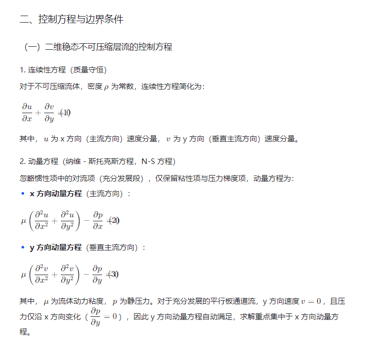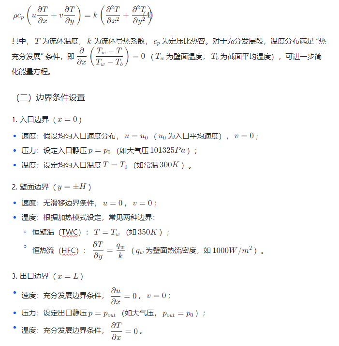 平行板层流加热通道流广泛存在于微电子散热(如芯片冷却通道)、化工换热(如微反应器流道)、航空航天热控(如卫星热管)等领域。这类场景的核心需求是精准获取流场的速度分布(判断流动均匀性)、压力分布(评估流动阻力)与温度分布(优化换热效率),而实际工况中通道多为小尺寸(如微通道水力直径<1mm)、低雷诺数,且流体常为水、乙二醇等不可压缩介质,需通过数值方法求解耦合的流动与传热方程。