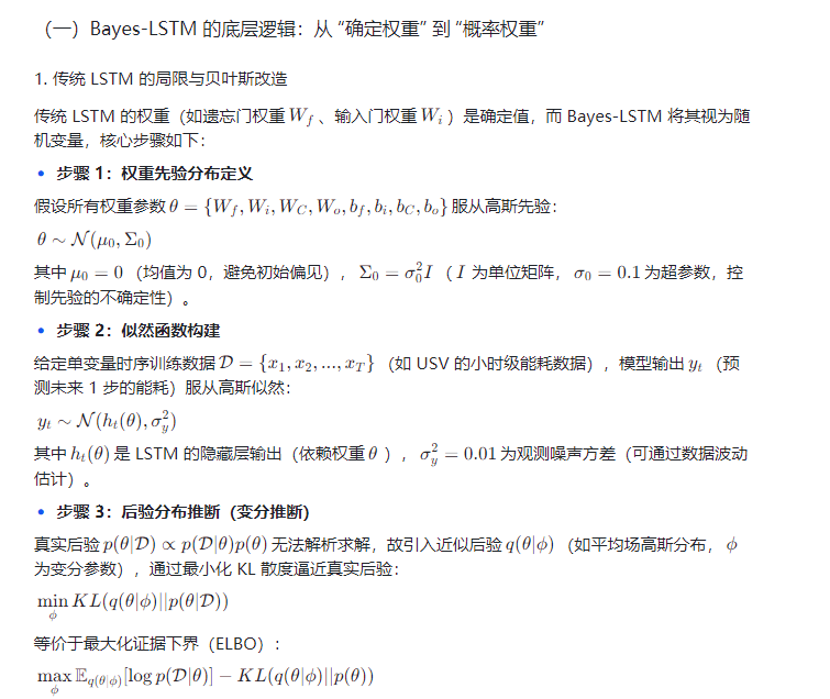 - 不确定性量化:通过对 LSTM 的权重参数赋予先验分布(如高斯分布),利用贝叶斯推断得到后验分布,输出预测值的概率分布(均值 + 标准差),而非单一数值;
