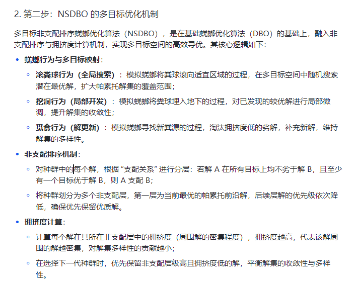 - 多目标非支配排序蜣螂优化算法(NSDBO):模拟蜣螂 “滚粪球 - 挖洞 - 觅食” 的行为,结合非支配排序机制,在 “预测误差最小化”“模型复杂度最小化”“鲁棒性最大化” 等多目标空间中,搜索帕累托最优解集,最终筛选出兼顾多需求的最优模型配置。