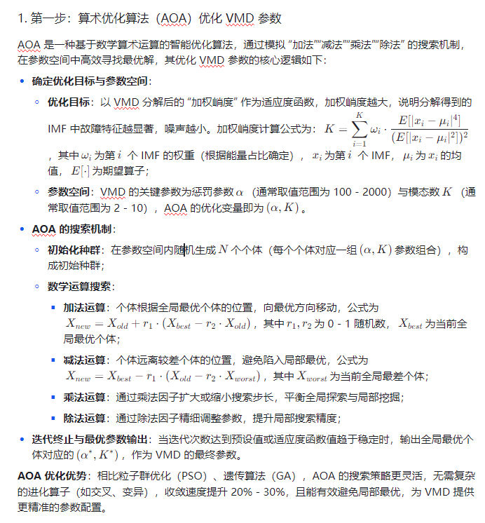 - 算术优化算法(AOA):作为 “参数优化工具”,模拟数学运算中 “加法”“减法”“乘法”“除法” 的搜索策略,在 VMD 的参数空间(α 与 K)中高效搜索最优组合,避免人工调参的主观性与网格搜索的低效性,为信号分解提供最优参数配置;
