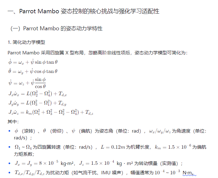 arrot Mambo 作为典型的消费级小型无人机(重量约 190g,轴距 24cm),凭借便携性与低成本优势,广泛应用于教学实验、室内巡检、微物运输等场景。但其姿态控制面临独特挑战:一是硬件限制,搭载的微型 IMU(惯性测量单元)存在明显噪声(角速度测量误差 ±0.5°/s),无 GPS 时依赖视觉里程计易受光照干扰;二是动力学耦合,旋翼转速变化会同时影响滚转、俯仰与升力,姿态调整存在强耦合干扰;三是环境敏感性,室内气流(如空调风、人员走动气流)会导致姿态角瞬时偏移(可达 5°~10°),传统 PID 控制难以快速补偿。