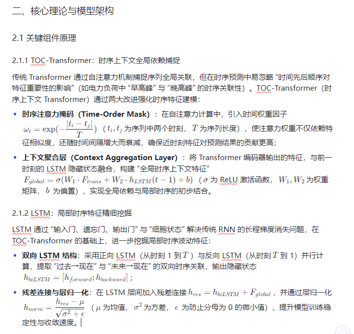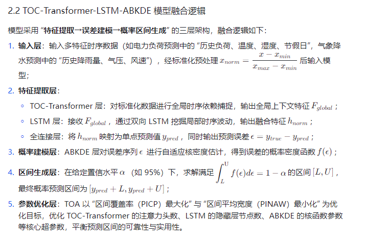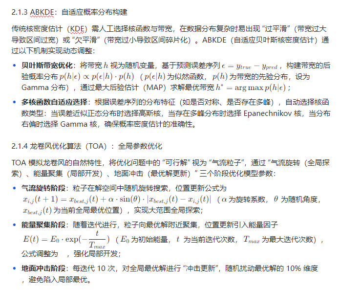 TOC-Transformer-LSTM-ABKDE(Time-Order Context Transformer-Long Short-Term Memory-Adaptive Bayesian Kernel Density Estimation)模型的提出,通过 “时序上下文 Transformer(TOC-Transformer)捕捉全局依赖、LSTM 挖掘局部时序特征、自适应贝叶斯核密度估计(ABKDE)构建概率分布” 的三层架构,突破传统模型局限;而龙卷风优化算法(Tornado Optimization Algorithm, TOA) ,模拟龙卷风 “气流旋转上升 - 能量聚集 - 精准冲击” 的运动特性,具备强全局寻优能力,可高效优化模型超参数与区间边界参数。本文将构建 “数据预处理→特征提取→参数优化→概率区间生成” 的完整框架,结合电力负荷与气象降水两类典型案例,验证该方法在概率区间预测中的优越性,为高可靠性预测任务提供技术支撑。