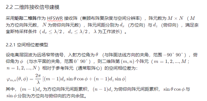本文聚焦基于二维阵的 HFSWR 电离层回波方向估计技术,构建 “电离层回波信号建模→二维阵接收模型→高分辨率方向估计算法设计→性能验证” 的完整框架,重点解决电离层回波 “弱信号检测、时变方向跟踪、角度模糊抑制” 三大问题,为 HFSWR 电离层回波利用与目标干扰抑制提供技术方案。